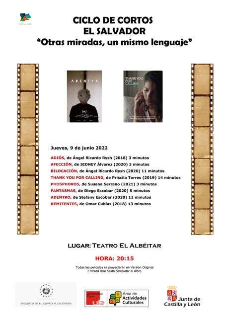 El Teatro El Albéitar de la Universidad de León (ULE) acoge este jueves 9 de junio la proyección de ocho cortometrajes de El Salvador, en el marco del ciclo titulado “Otras miradas un mismo lenguaje”. Será a partir de las 20:15 horas, con entrada libre. Las invitaciones se podrán recoger en la taquilla del teatro a partir de las 20:00 horas.
