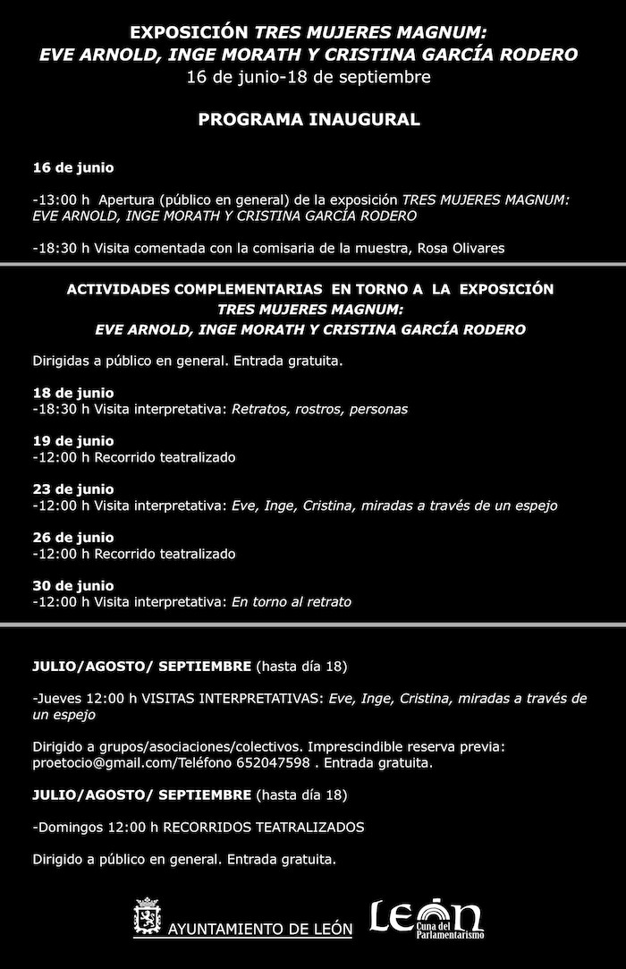 «Tres mujeres Magnum: Eve Arnold, Inge Morath y Cristina García Rodero», protagonizan la nueva propuesta expositiva del Palacín de León. La muestra, que se inaugura este jueves 16 de junio, está compuesta por 60 imágenes seleccionadas entre más de 3.000 fotografías. Se completa con un programa de actividades compuesto por visitas guiadas, comentadas y teatralizadas. Entrada gratuita.
