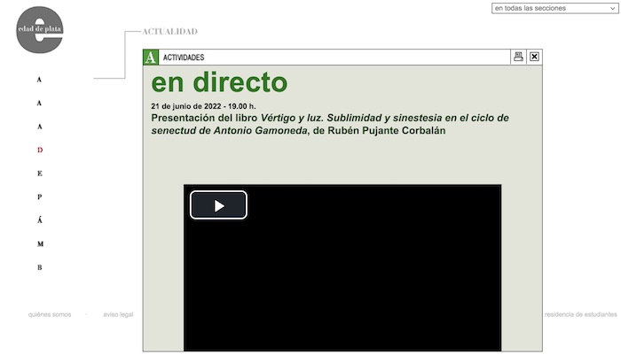 También este martes 21 de junio, a las 19 horas, la Residencia de Estudiantes (Madrid) acogerá la presentación del premiado ensayo «Vértigo y luz. Sublimidad y sinestesia en el ciclo de senectud de Antonio Gamoneda», de Rubén Pujante Corbalán.