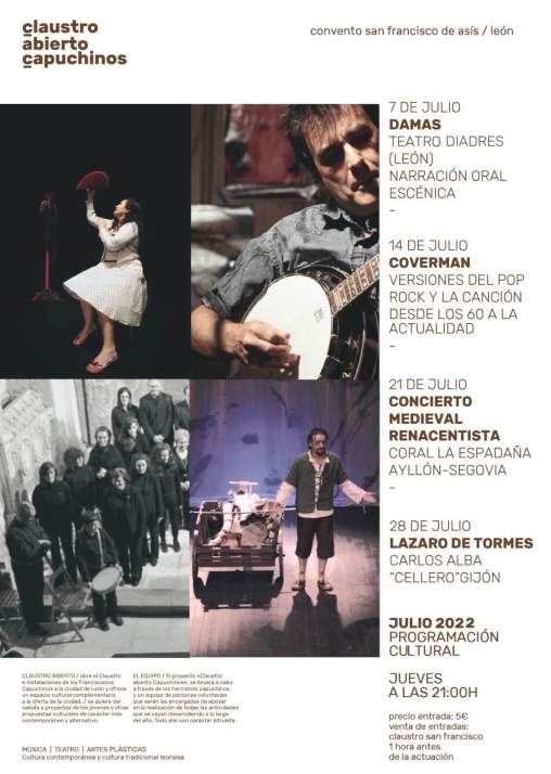 Por segundo año, el Claustro Abierto Capuchinos (Convento de San Francisco de Asís, en León) pone en marcha el Programa Claustro abierto «Expresa», con cuatro actuaciones de diferentes disciplinas a lo largo del mes de julio: música, teatro, narración oral… Se llevará a cabo los jueves a las 21 horas, en el Claustro San Francisco, al aire libre. Precio: Donativo 5€. La entrada se podrá adquirir 1 hora antes de cada actuación.