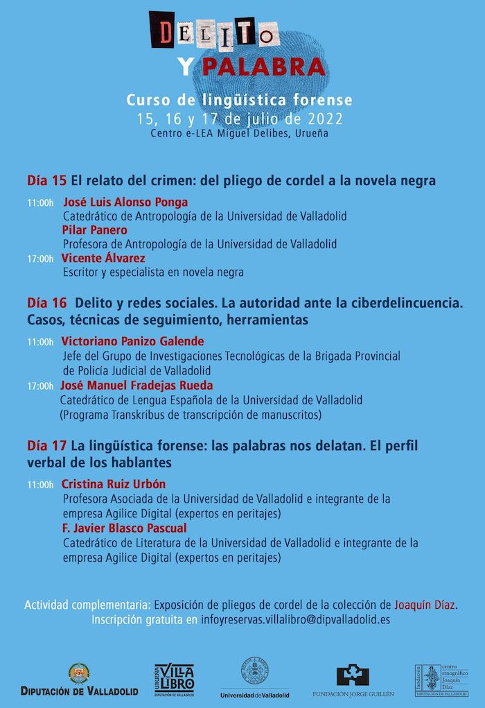 Dada la gran aceptación que el año pasado tuvo el Curso de Lingüística Forense que se organizó en la Villa del Libro de Urueña (Valladolid), este año han decidido hacer una edición más ampliada y profunda. Tendrá lugar del 15 al 17 de julio de 2022. En el programa está toda la información para inscribirse y asistir.