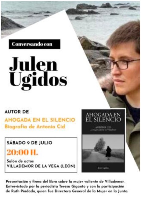 Este sábado 9 de julio de 2022, a las 20 horas, la Casa de Cultura de Villademor de la Vega (León) acogerá la presentación de “Ahogada en el silencio”, de Julen Ugidos. El libro es una biografía de Antonia Cid, una mujer de Villademor que tuvo la valentía de denunciar a su marido por violencia de género en el siglo XIX. En el acto, además del autor, intervendrán la periodista Teresa Giganto y Ruth Pindado, ex directora general de la Mujer en Castilla y León.