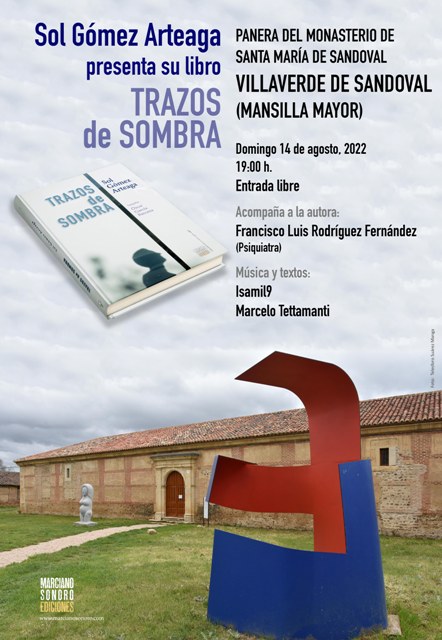 La Panera del Monasterio de Santa María de Sandoval (Villaverde de Sandoval – Mansilla Mayor) acoge este domingo 14 de agosto, a las 19:00 horas, la presentación del nuevo libro de Sol Gómez Arteaga titulado “Trazos de sombra”, publicado por Marciano Sonoro Ediciones. La autora contará en esta ocasión con el psiquiatra Francisco Luis Rodríguez Fernández e Isamil9 y Marcelo Tettamanti en el acompañamiento musical y la lectura de textos.