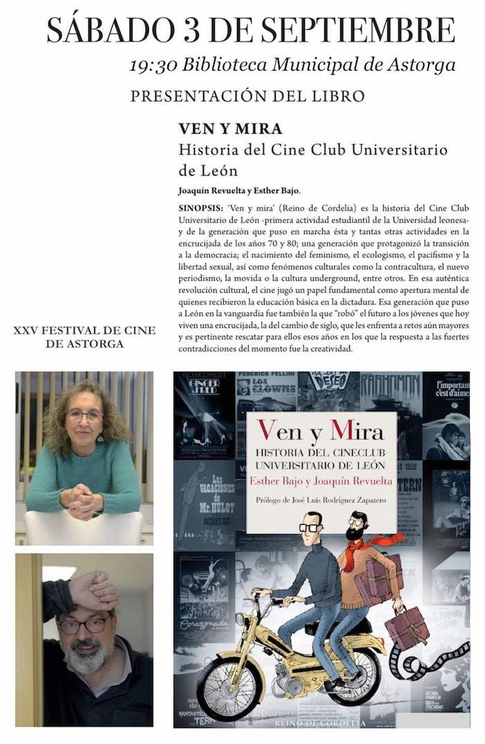 Los periodistas leoneses Esther Bajo y Joaquín Revuelta presentan este sábado 3 de septiembre de 2022, en la Biblioteca Municipal de Astorga, su libro: Ven y mira. Historia del Cineclub Universitario de León (Reino de Cordelia, 2022).