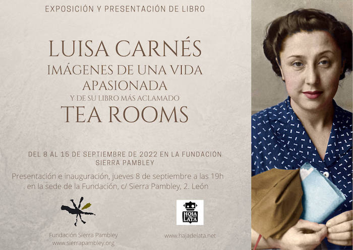 Este jueves 8 de septiembre, a las 19 horas en el salón de actos de la Fundación Sierra Pambley (León), se inaugura la exposición fotográfica «Luisa Carnés: imágenes de una vida apasionada» y la presentación de su libro más aclamado Tea rooms, considerado por la crítica «una de las 10 mejores novelas españolas escritas por mujeres de los siglos XX y XXI».
