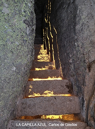 Carlos de Gredos (Hoyocasero, 1958), alma mater de esta proyecto, muestra la intervención “La Capilla Azul”. Aprovechando una grieta natural ha construido una escalera con los peldaños volados. Y así lo explica: “Antes de acceder a ella nos encontramos con dos grandes rocas y en una el poema concreto tallado en alemán, STERBEN, ERBEN, STERN (morir, heredar, estrella), con estas palabras podríamos escribir el pensamiento, ‘al morir heredamos una estrella’. La palabra estrella en la última línea invita al descenso por la escalera de la Capilla, encontrándonos al salir cinco estelas con estrellas talladas en la cara superior, dispuestas a recibir agua. Podremos elegir y heredar lo que ya somos, estrellas”.
