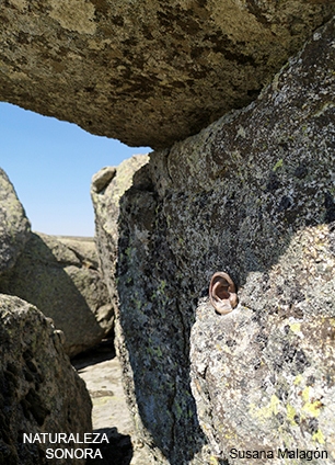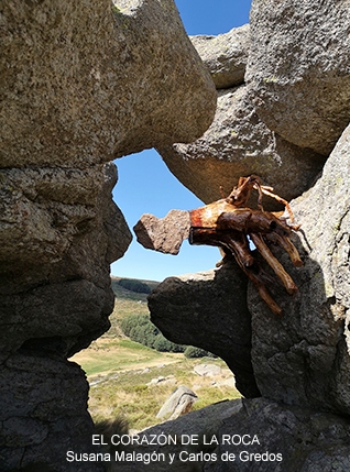 La tercera intervención que se puede ver en el recorrido y abre esta 13ª temporada corresponde a Susana Malagón y Carlos de Gredos. Ambos artistas han creado “El corazón de la roca”. Planteada como un emblema con dos elementos unidos, un tocón de pino proveniente del Pinar de Hoyocasero y una laja de granito encontrada con forma de corazón, sin tallar. El emblema está alojado en un boquete entre dos grandes rocas. “El tocón se alimenta de la roca, el corazón del tocón y todos del aire del lugar que nos hace sentir”.