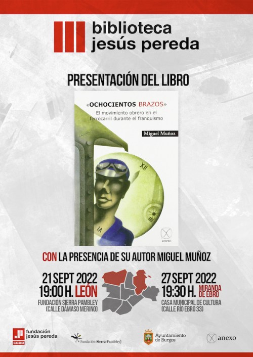 El historiador Miguel Muñoz presenta en la Fundación Sierra Pambley (León) el día 21 de septiembre, y en la Casa Municipal de Cultura (Miranda de Ebro) el día 27, su libro «Ochocientos brazos» (Anexo Editorial), en el que analiza el movimiento obrero en el ferrocarril durante el franquismo.