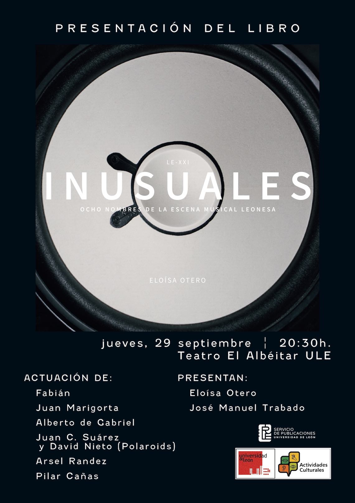 El libro-disco «INUSUALES LE-XXI · Ocho voces de la escena musical leonesa» (Servicio de Publicaciones de la Universidad de León, 2021), de Eloísa Otero, se presentará el próximo jueves 29 de septiembre de 2022, a las 20:30 horas, en el teatro El Albéitar, con música en directo por parte de algunos de sus protagonistas y entrada libre.