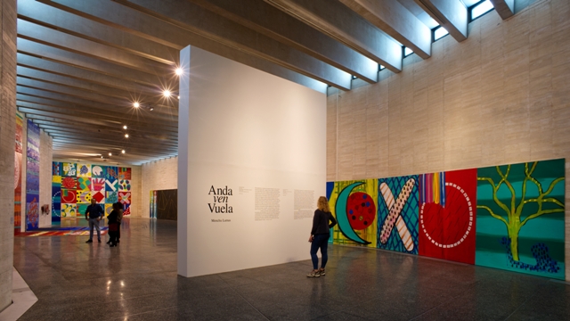 En esta gran instalación se pueden encontrar los motivos, formas y elementos que distinguen su lenguaje -la línea, el punto-, un vibrante universo simbólico que aúna recursos abstractos y figurativos -amebas, árboles, seres humanos, paisajes y figuras geométricas- donde el uso del color adquiere protagonismo. “Mi intención es introducir al espectador en mi estudio” explica la propia artista. «Es una relación de tú a tú lo que yo quiero presentar aquí. Cuando el título es Anda- Ven- Vuela quiero que sea una introducción a distintos estados: ven hasta aquí, un museo de arte contemporáneo; entra en la pintura, entra en este bosque, en este útero de color, en este mundo pictórico, el mío, pero también en el mundo pictórico de la mente de cada uno de los espectadores. Cuando llegas lo primero que recibes es un impulso de color, pero después es como un bosque dónde vas encontrando una mano, una figura humana, una silueta de mujer, un gesto, una forma geométrica. Va apareciendo el vacío, el lleno, la pasión del color, la pasión de la reflexión, de la geometría como lugar en el que tú te encuentras cómodo. Me gustaría que la gente que venga se pare mucho tiempo encontrando las cosas. Encuentras un círculo, un gesto, una línea. Todo eso es una reflexión lenta, la primera mirada es fuerte y la segunda es lenta de reflexión”.