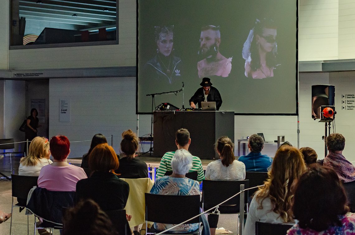 Es interesante ver cómo el flamenco se reinventa de manera extraordinaria y lo hace con artistas vinculados a lo musical y a la parte más conceptual del arte. En esta investigación, como viene haciendo en su trayectoria artística, Derek Van Den Bulcke escoge el error y sus efectos propios en lo digital, el llamado glitch, y lo utiliza como elemento generador. El artista pone el acento en lo musical y como DJ termina de construir la pieza sonora en el momento, basándose en la improvisación y el apropiacionismo. En esta construcción, el maestro de ceremonias aparece más alto, está subido en un pequeño escenario. Detrás y un poco más elevada, hay una proyección en loop de tres cabezas que giran impasibles durante los 50 minutos que dura la sesión, y que generan una mirada desconcertante.