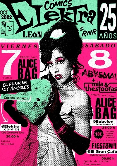 Elektra Cómics (León) cumple 25 años este fin de semana y lo celebra este 7 y 8 de octubre con una charla de la artista Alice Bag sobre el Punk en Los Ángeles, y los conciertos de AbYsMaL y Mila & The Stoofas, en la sala Babylon. Ambas citas serán el viernes a las 20:00 horas y el sábado a las 21:00 horas. Además, el sábado a partir de la media noche está prevista una fiesta con pinchas en la planta de arriba de El Gran Café.