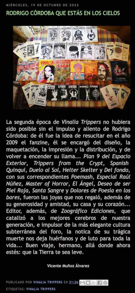 Mi amigo Rodrigo era muchas cosas además, porque nos ha dejado cientos de libros editados, de autoras y autores para muchos desconocidos, pero importantes para él. Publicó poesía, editó fanzines, organizó ferias, recitales, encuentros, multitud de eventos. Generó vínculos de amor, lazos poéticos, ataduras de amistad, con la delicadeza absoluta que sólo el amor al arte es capaz de establecer, sin el ánimo del lucro, con el compromiso de los márgenes y la intemperie, porque creía ciegamente en la subcultura. Obvio, sólo un currela, un obrero, un operario, tiene la capacidad de darse más allá del ámbito profesional.