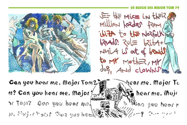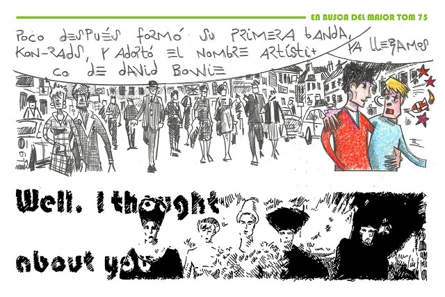 Tira 79 y última de “En busca del Major Tom”, del dibujante leonés Alberto D. Nogal. Una historieta gráfica de 28 páginas, ejecutada en técnica mixta con lápices de colores y ordenador, y concebida para la colección ArteBowie de Carlos Luxor. Cada semana hemos publicamos una nueva tira, hasta 78 en total más la portada, de esta historia medio pop, medio naif, inspirada en el Major Tom, el personaje ficticio creado por David Bowie, en Space Odity, la mítica canción de 1969 en la que narra el viaje iniciático de este astronauta, rumbo a las estrellas.
