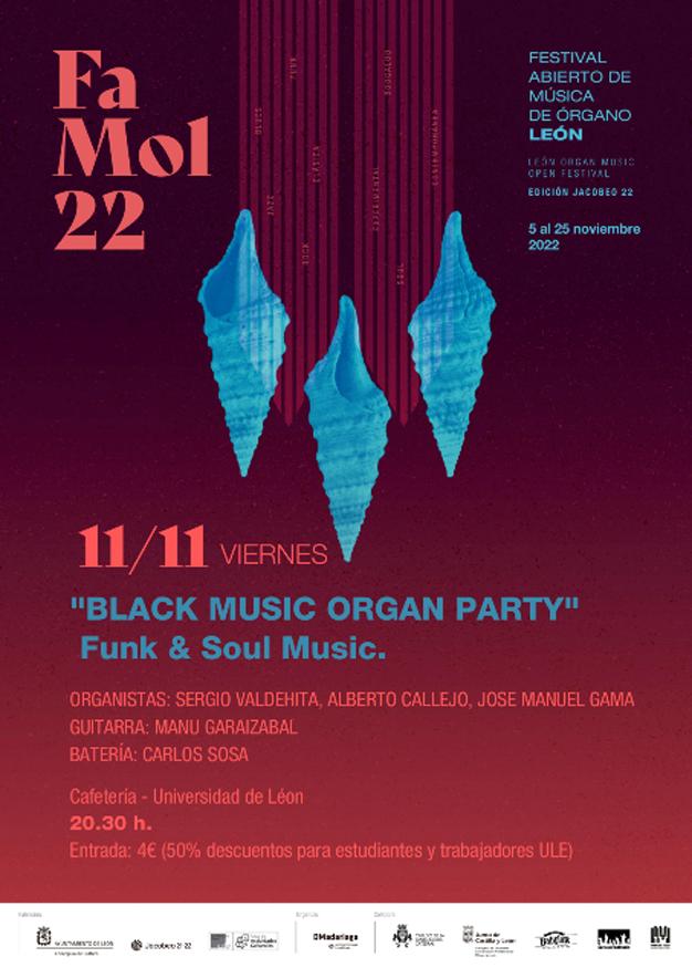 La Cafetería del Campus de Vegazana de la Universidad de León (ULE) ofrece este viernes 11 de noviembre a partir de las 20:30 horas un concierto de funk y soul, titulado “Black Music Organ Party». La actividad forma parte del Festival Abierto de Música de Órgano de León (FAMOL 2022). Las entradas, a 4 euros, se podrán recoger en la cafetería a partir de las 20:15 horas.