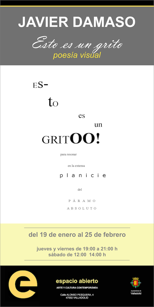 El poeta vallisoletano Javier Dámaso presenta este jueves 19 de enero, a las 19:30 horas en Espacio abierto (Valladolid) la exposición de poesía visual titulada «Esto es un grito». Se podrá ver hasta el 25 de febrero de 2023.