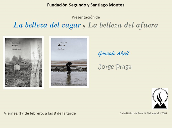 Este viernes 17 de febrero, a las ocho de la tarde, la Fundación Segundo y Santiago Montes acogerá en Valladolid la presentación de los dos últimos títulos de la colección “De la belleza” (Eolas Ediciones), de la que han ido saliendo en estos meses los seis primeros números. Se trata de La belleza del vagar, de Gonzalo Abril y La belleza del afuera de Jorge Praga.