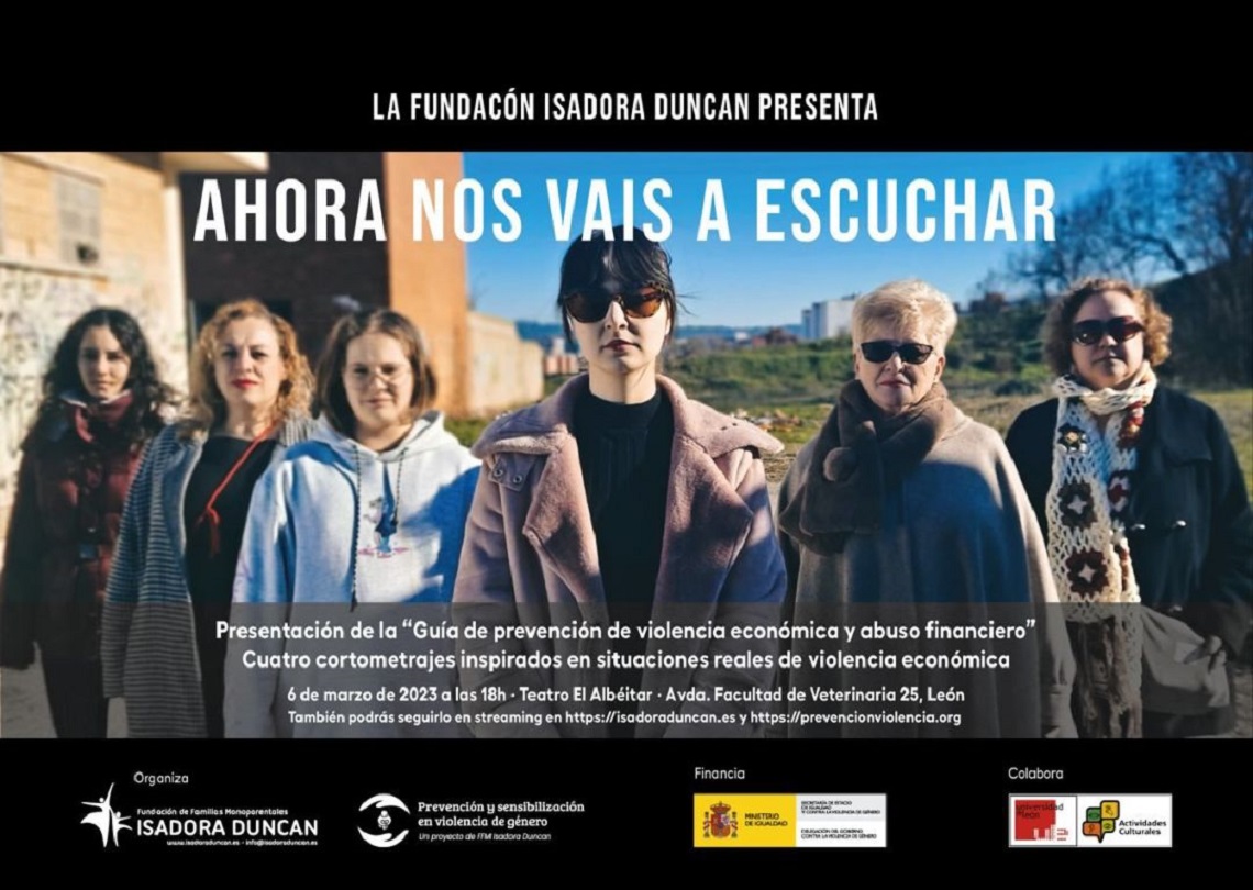 Dentro de las actividades programadas para conmemorar el Día Internacional de la Mujer, que se celebra el próximo 8 de marzo, la Fundación Isadora Duncan presenta el lunes 6 de marzo su campaña audiovisual de sensibilización contra la violencia económica. Será en el Teatro El Albéitar (León) a las 18:00 horas, e incluye el estreno de cuatro videoclips inspirados en situaciones reales, protagonizados por un elenco de actores con sello leonés al cien por cien.