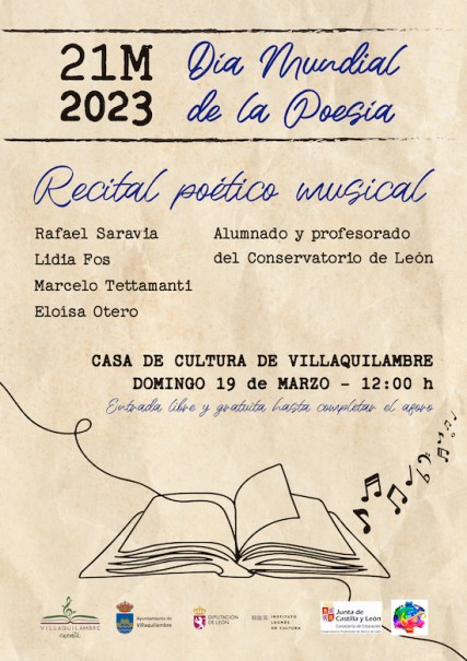 Recital poético musical a cargo de cuatro poetas leoneses (Rafael Saravia, Lidia Fos, Marcelo Tettamanti y Eloísa Otero) y alumnado y profesorado del Conservatorio de León que reside en Villaquilambre, con motivo del Día Mundial de la Poesía que se conmemora el 21 de marzo. Adjuntamos cartel y rogamos difusión.