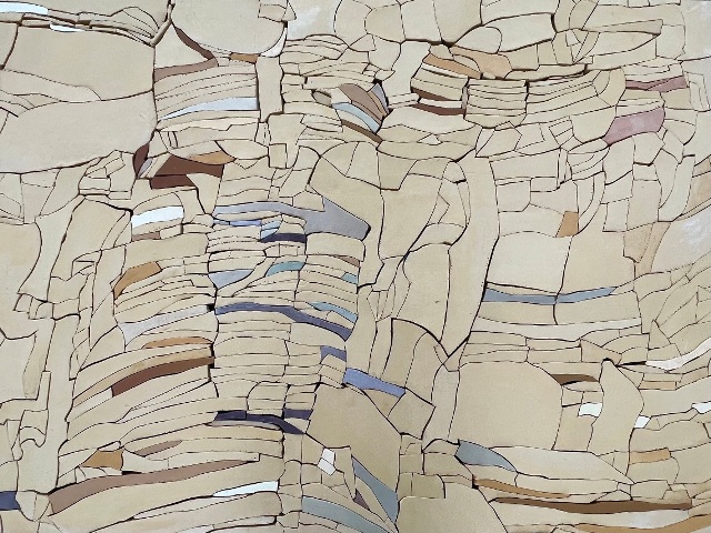 La exposición en la Fundación Cerezales supone el punto final de este proceso de investigación y reúne las piezas creadas en este periodo de trabajo: La serie pictórica Schist Wall (2022) para contextualizar el tiempo geológico del proyecto; la serie de dibujos y pinturas River lines (2022-2023) en las que guardar el registro vertical de la orografía recogiendo los cambios de cota del nivel del agua de las laderas del Cañón del Sil del embalse de San Esteban. River Geometries (2022-2023) en la que la artista materializa el registro horizontal de la superficie del agua en una serie de dibujos y en una instalación cerámica que recoge la representación de las secciones del volumen del agua en relación a la profundidad de la cota más baja a escala 1:10.