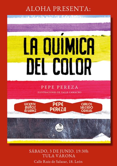 Pepe Pereza (Guijuelo, Salamanca, 1964) presentará el sábado 3 de junio a las 19:30 horas, en la librería Tula Varona (C/ Ruiz de Salazar, 18), su nuevo libro de relatos: “La química del color”, publicado por la editorial riojana Aloha. Estará acompañado por los escritores leoneses Vicente Muñoz Álvarez y Carlos Salcedo Odklas, con los que conversará sobre la situación del relato breve y el realismo sucio en el sector editorial.
