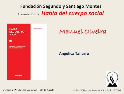 La Fundación Segundo y Santiago Montes (Valladolid) recibe este viernes 26 de mayo de 2023, a las 20 horas, al ex director del MUSAC, Manuel Olveira, que presentará su ensayo: «Habla del cuerpo social. Pandemia y politización del espacio público» (Brumaria), acompañado por la periodista Angélica Tanarro.
