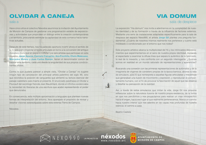 El espacio Nexo990 de Monzón de Campos (Palencia) inicia su quinta temporada con una doble propuesta expositiva. Por un lado, “Via domum”, exposición de Jorge Gil que invita a adentrarnos en la complejidad de nuestra identidad y de su formación a través de la influencia de factores externos. Buscando una conexión con las primeras representaciones de autómatas y de la imaginería de vírgenes de candelero propias de la época barroca, Jorge Gil aborda la idea de simulacro, para lo que reinterpreta a aquellas figuras articuladas y mecánicas.