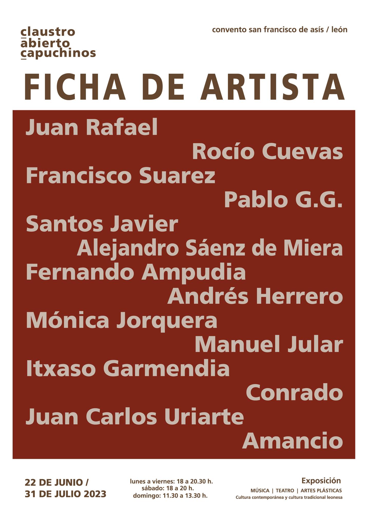 Ficha de artista 21 de junio de 2023 Return to: ÚLTIMO DÍA / Catorce creadores leoneses en «Ficha de artista», una exposición en el Claustro Abierto de los CapuchinosMáxima resolución (1434 × 2048) Image navigation Siguiente imagen