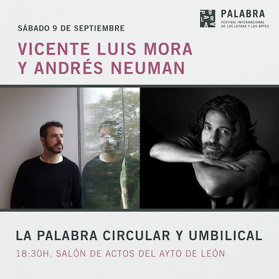 - 18:30h. “La palabra circular y umbilical” con Vicente Luis Mora y Andrés Neuman. Lugar: Salón de actos del Ayuntamiento de León. Calle Alfonso V.