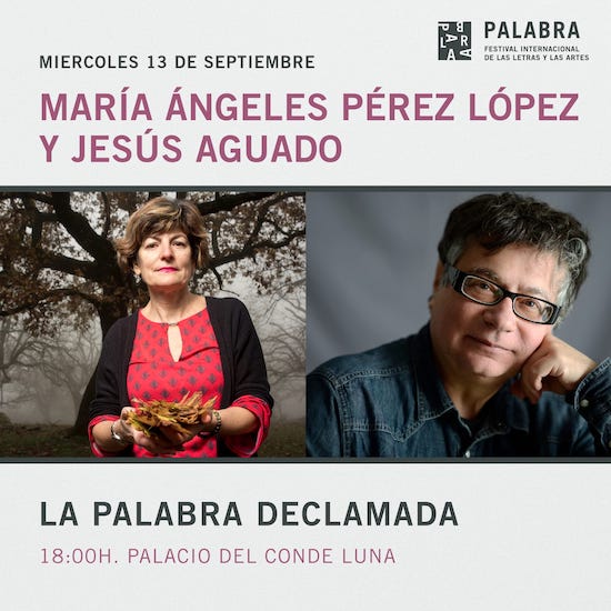 La séptima jornada del Festival Palabra comenzará a las 18:00 en el Palacio Conde Luna de la mano María Ángeles Pérez López y Jesús Aguado, quienes protagonizan una nueva entrega de «La palabra declamada», tras haber participado el día anterior en una mesa redonda con la XXI Premio Leteo, Chantal Maillard.