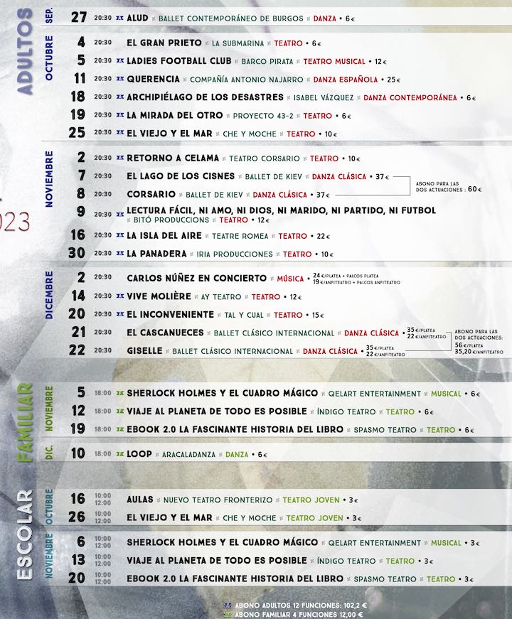 Del 27 de septiembre al 22 de diciembre habrá espectáculos a cargo de compañías y artistas como El Barco Pirata, la compañía de danza española Antonio Najarro, la compañía de danza de Isabel Vázquez, Proyecto 43-2, Che y Moche, Teatro Corsario, el Ballet de Kiev, Teatro Romea, Bitó Producciones, Iria Producciones, Carlos Núñez, Ay Teatro, Tal y Cual, el Ballet Clásico Internacional, Qelart Entertainment, Índigo Teatro, Spasmo Teatro y Nuevo Teatro Fronterizo.