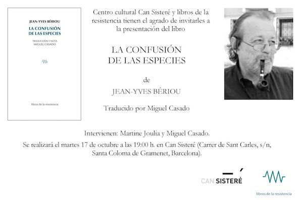 ‘La confusión de las especies’ (libros de la resistencia, 2023), del poeta francés afincado en Cataluña Jean-Yves Bériou, con traducción del poeta y crítico vallisoletano afincado en Toledo Miguel Casado, se presentará este mes de octubre (días 17, 18 y 20) en Santa Coloma de Gramanet, Barcelona y Madrid.