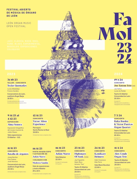 Desde el próximo 31 de octubre y hasta el 11 de abril FAMOL ofrece once propuestas, ocho de ellas conciertos, en diferentes ubicaciones de la ciudad. Todas ellas con la misma premisa: poner en valor el instrumento del órgano en toda su amplitud estilística e interpretativa. En esta nueva edición del festival se realizará un repaso por diferentes estilos musicales: jazz, música clásica, rock, soul, funk, blues, experimental y boogaloo.