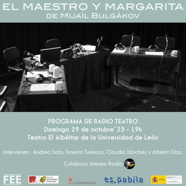 “El maestro y Margarita”, del médico, escritor y dramaturgo ruso Mijaíl Bulgakov, es la obra elegida para el tercer programa de radio-teatro que organiza la Feria de Editores con E (FEE). Será este domingo, 29 de octubre, a las 19 horas en el teatro El Albéitar (León). Ante los micrófonos se sentarán Andrea Soto, Alberto Díaz, Rubén Ochoa, Claudia Sánchez y Ernesto Turienzo, y el guion lleva la firma de Magalí Labarta. Entrada libre.
