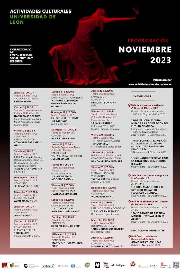 El Albéitar se vuelca en un mes de noviembre plagado de actividades culturales Eloísa Otero31 de octubre de 20233 de noviembre de 2023CULTURA, MÚSICA, TEATRO Navegación de entradas AnteriorSiguiente Toda la información en la página del Área de Actividades Culturales de la Universidad de León…. Comparte esto:TweetMás Imprimir (Se abre en una ventana nueva) Imprimir Compartir en Tumblr Compartir en WhatsApp (Se abre en una ventana nueva) WhatsApp Enviar un enlace a un amigo por correo electrónico (Se abre en una ventana nueva) Correo electrónico Me gusta Cargando... Relacionado
