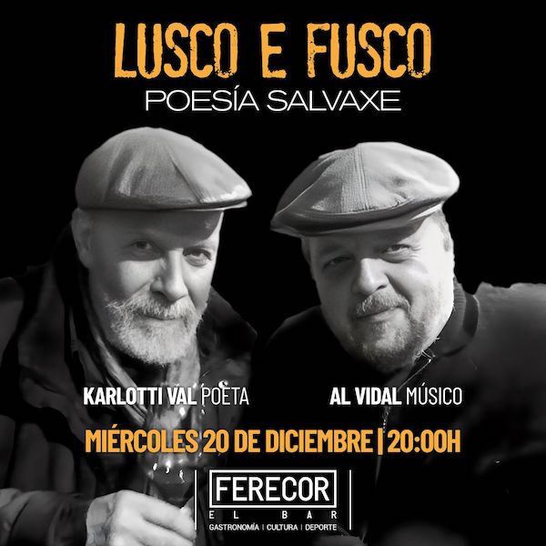 Con todo a media luz, el miércoles 20 de diciembre, a las 20 horas, llegarán Karlotti Val y Al Vidal al Ferecor, el bar, en León (un poquito más allá del antiguo cine Abella). Entre dos luces, la voz y la música de estos grandes amigos. Entre perro y lobo (entre chien et loup), dice el francés; Luscofusco, el portugués.