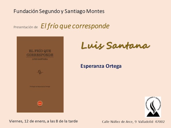 Este viernes 12 de enero de 2024, la Fundación Segundo y Santiago Montes acogerá en Valladolid la presentación de ‘El frío que corresponde’ (Ediciones Contrabando, 2023), del poeta Luis Santana, quien estará acompañado por la poeta Esperanza Ortega, autora del prólogo.