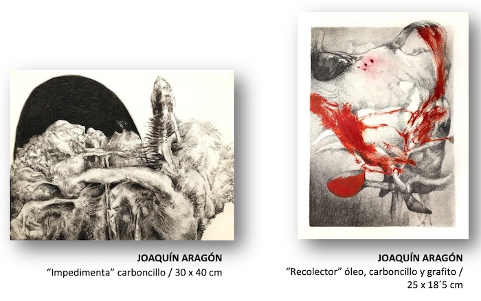 La obra de Joaquín Aragón tiene una entidad propia, aborda su proceso creativo desde el dibujo, lápices, tintas y oleos para elaborar mundos desconocidos. Entre la improvisación y el vértigo de los caminos por descubrir sus obras destilan sinceridad, contundencia y sensibilidad. Su fascinación por la naturaleza está presente en sus trabajos que se tornan en personajes imaginados, en elementos germinales y en paisajes orgánicos y escenografías con tintes orientales.