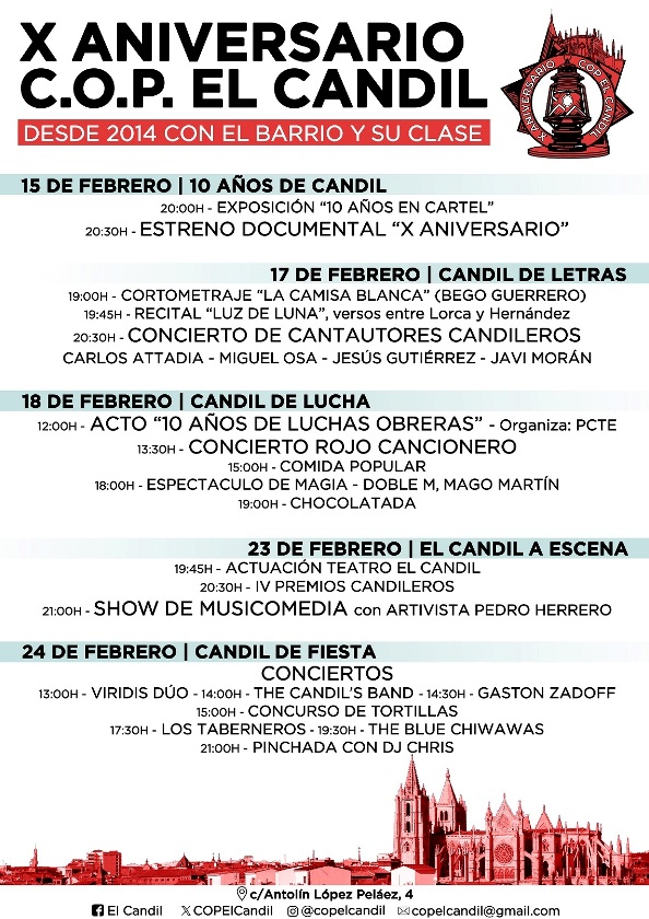 Exposiciones, documentales y cortometrajes, teatro y música en directo. Es la propuesta de la asociación del Centro Obrero y Popular El Candil para celebrar, entre el 15 y el 24 de febrero, una década en el barrio leonés de El Ejido. Un amplio programa de cultura, ocio y política que refleja la actividad que ha desarrollado en su local de la calle Antolín López Peláez a lo largo de estos diez años.