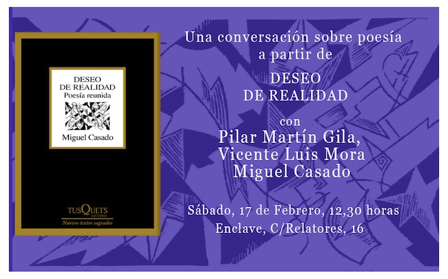 La librería Enclave, en Madrid, acogerá este sábado 17 de febrero, a las 12:30 horas, una conversación sobre poesía a partir del libro «Deseo de realidad. Poesía reunida» (Tusquets Editores, 2023), del poeta, traductor, ensayista y crítico vallisoletano Miguel Casado. El autor estará acompañado por los críticos y escritores Pilar Martín Gila y Vicente Luis Mora.