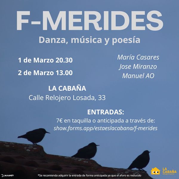 Entrada: 7 euros previa reserva a través de la página https://show.forms.app/estaeslacabana/f-merides