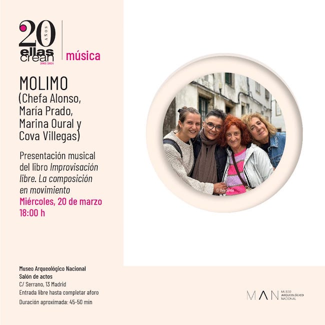 El trío de improvisadoras ‘Molimo’ (Chefa Alonso, María Prado y Cova Villegas) actuará en el Festival Ellas Crean, el miércoles 20 de marzo, a las 18 horas. Y lo hará en cuarteto, con la poeta Marina Oural. Será en el salón de actos del Museo Arqueólogico Nacional, en Madrid (C/Serrano 13), con entrada libre hasta completar aforo.