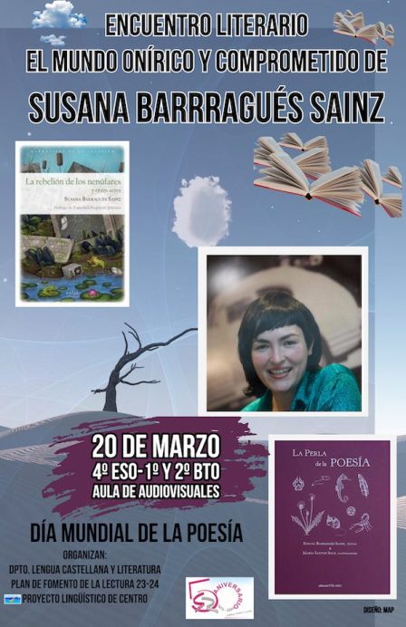 Susana Barragués tiene galardones tan importantes como el Premio de Letras Jóvenes de CYL o el Premio Nacional de Juventud INJUVE de Poesía. Pero sin lugar a duda, el mejor reconocimiento es que leamos sus obras y más como celebración en el Día de la Poesía que se conmemorará al día siguiente, 21 de marzo. Un absoluto privilegio contar con esta escritora en el Giner de los Ríos, instituto que está celebrando su 50 aniversario y que, como dijo Don Francisco Giner de los Ríos respecto a la educación “enseña a pensar y a vivir”.