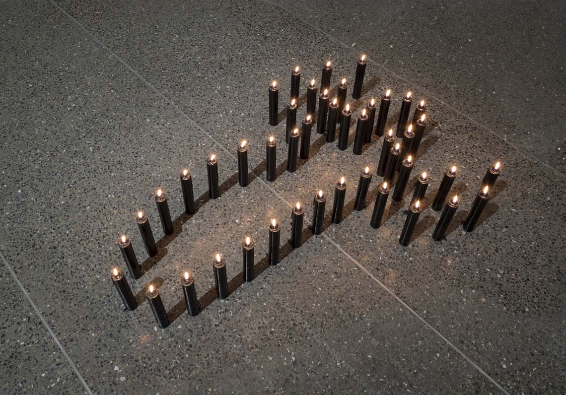 La instalación “Untitled (Náñigo Burial)”, que la artista Ana Mendieta concibió en 1976, podrá verse iluminada. La obra, compuesta por 47 velas votivas negras, adopta la forma de una silueta con los brazos levantados en la pose de la diosa madre. El título hace referencia a los Abakuá, una sociedad secreta dentro de la tradición de la santería afrocubana, que combina la religión yoruba de los esclavos africanos, el catolicismo y las influencias amerindias. Los miembros de esta sociedad se denominan ñáñigos.