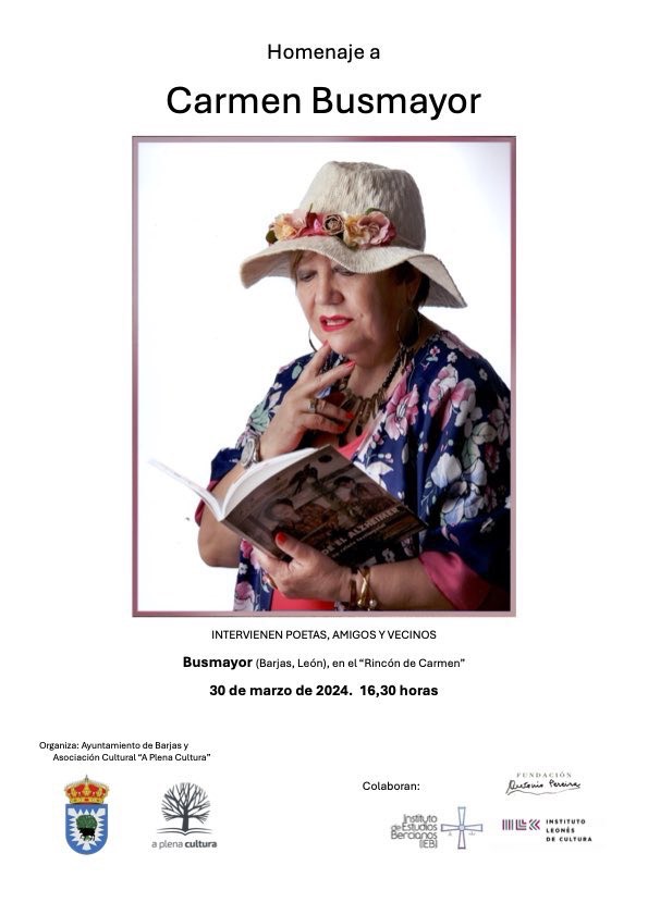 Este sábado 30 de marzo a las 16:30 horas, en el pueblo de Busmayor (Ayuntamiento de Barjas, El Bierzo, León), la poeta Carmen Busmayor (seudónimo de Carmen López) recibirá el merecido homenaje de los vecinos del pueblo y de la familia, amigos, escritores, poetas y todas las personas que quieran acercarse.