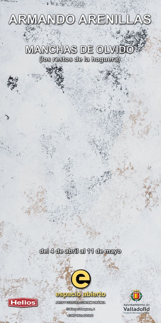espacio abierto (C/Alonso Pesquera 4, en Valladolid) presenta este jueves 4 de abril de 2024, a las 19:30 horas, la exposición ‘Manchas de olvido (los restos de la hoguera)’, de Armando Arenillas. Se podrá visitar hasta el 11 de mayo. Reproducimos el texto del catálogo, del que es autora Blanca García Vega, catedrática de Historia del Arte, vicepresidenta de AICA/Spain, presidenta de ACYLCA.