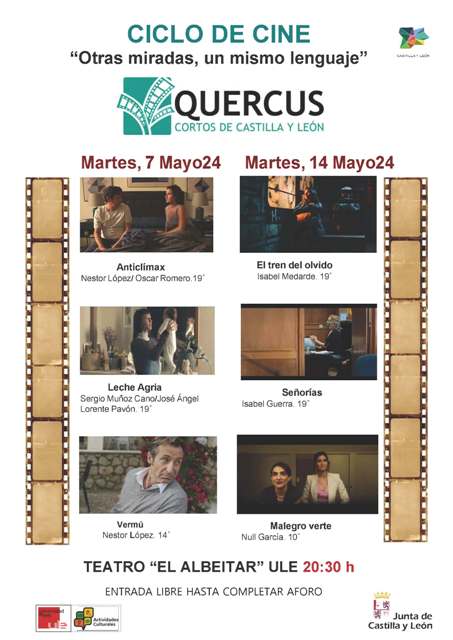 Dentro de la programación del ciclo de cine “Otras miradas un mismo lenguaje”, el Teatro El Albéitar de la ULE ofrece este martes 7 y el martes 14 de mayo, la proyección de seis cortometrajes incluidos en el catálogo “Quercus 2023”. Todos fueron rodados en Castilla y León, y se podrán disfrutar con entrada libre, a partir de las 20:30 horas.