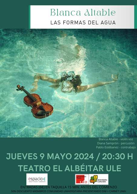 La compositora y violinista popular y experimental Blanca Altable llega este jueves 9 de mayo al Teatro El Albéitar acompañada de Diana Samprón y Pablo Estébanez para presentar su segundo álbum en solitario “Las formas del agua”. La artista burgalesa teje en este disco una sinfonía de sonido postfolk y postminimalista en la que conviven tradición y experimentación. El concierto (entradas a 6 euros, 50% descuento comunidad universitaria) comenzará a las 20:30 horas.