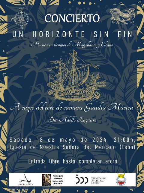 Con motivo del V Centenario que conmemora la Vuelta al Mundo de Magallanes y Elcano, el Coro de Cámara Gaudia Música ha diseñado un proyecto musical basado en obras del siglo XVI (Tomas Luís de Victoria, Juan del Enzina, Francisco Guerrero, cancionero de Palacio, cancionero de Uppsala) que tiene como hilo conductor el épico viaje magallánico. La Iglesia de Nuestra Señora del Mercado será el escenario de este concierto, en el cual los principales hitos de la travesía son representados por diferentes piezas musicales, entre las cuales se intercalan pequeños fragmentos del diario de a bordo del cronista Antonio Pigafetta.