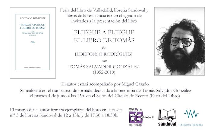 El próximo martes 4 de junio, el escritor Tomás Salvador González (Zamora, 1952-Móstoles, 2019) recibirá un homenaje póstumo en la Feria del Libro de Valladolid, donde también se presentará ‘Pliegue a pliegue. El libro de Tomás’ (libros de la resistencia, 2024), una obra que lleva la firma del músico y escritor leonés Ildefonso Rodríguez, amigo y compañero de generación del escritor y profesor que vivía en Arenas de San Pedro (Ávila), y del que este 28 de mayo se cumplen cinco años desde su fallecimiento.